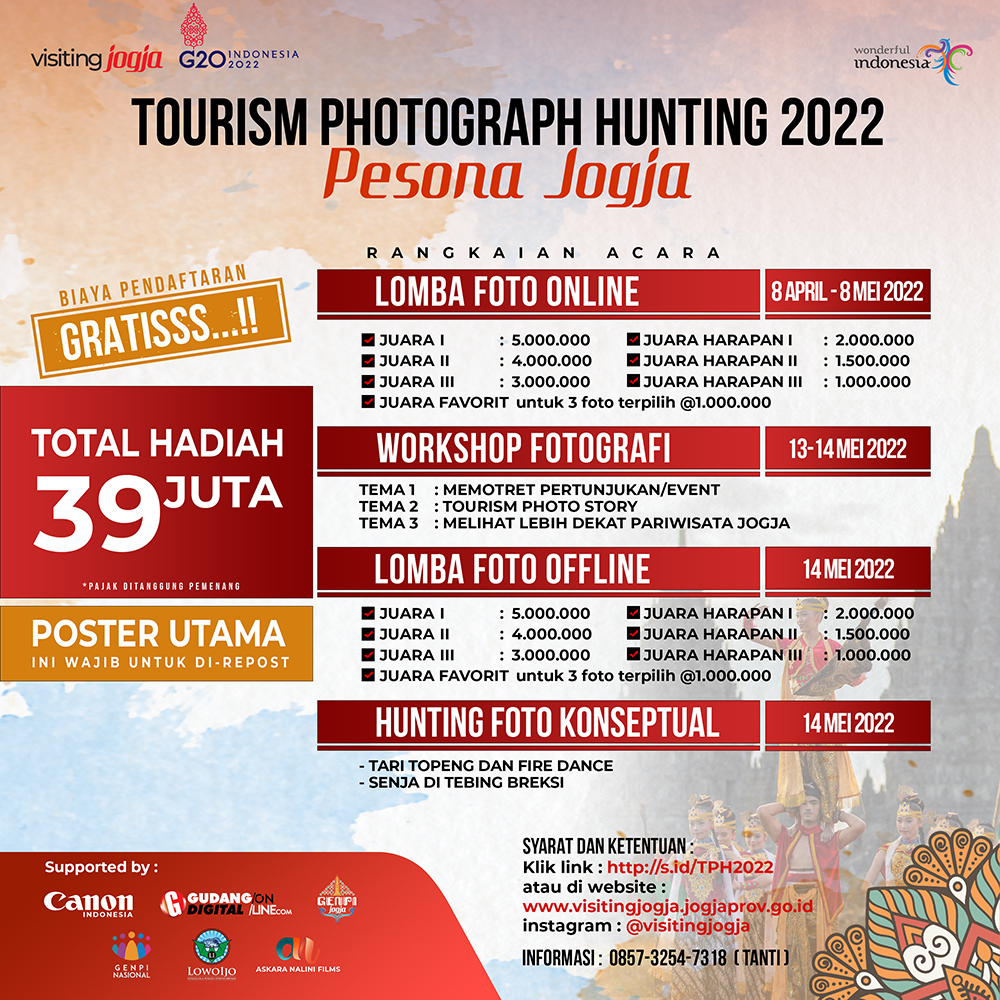 Ketua panitia Tourism Photograph Hunting 2022, Benny Sapti (Bidang Pemasaran Dispar DIY) menyampaikan bahwa workshop yang akan berlangsung 13 Mei 2022 mendatang dilaksanakan di Ballroom Hotel Alana Yogyakarta, yang rencananya akan berlansung dari jam 8.00 – 11.30 WIB.