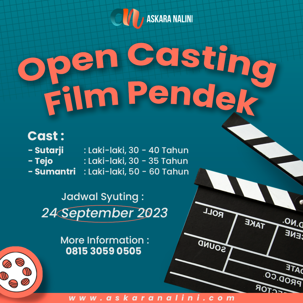 Askara Nalini FIlms kembali membuka kesempatan untuk casting lagi nih! Syuting akan dilakukan pada Minggu, 24 September 2023. Untuk kriteria dan ketentuan castnya seperti dibawah ini yaa…!